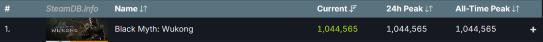 截止至8月20日11:00,据第三方网站steamDB统计数据显示,《黑神话:悟空》即登上Steam最热玩游戏榜首,全球同时在线人数已达到1044565人,已突破百万大关。