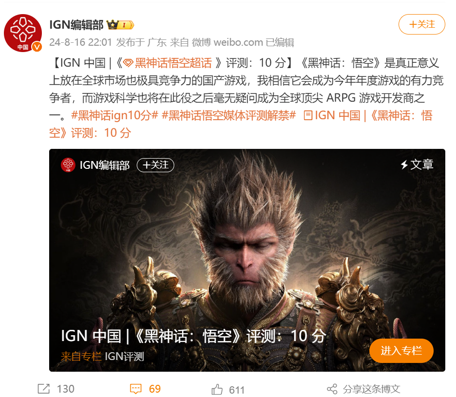 8月16日晚,在距离《黑神话:悟空》上市仅四天时,全球游戏媒体评分解禁,在B站上有超过620万人观看一条官媒评测视频,IGN中国甚至给这款游戏打出了10分的满分评价。