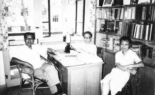 何祚庥夫妻俩与同事在办公室内