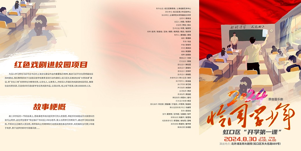 上海市虹口区是首批大思政课重点试验区,在常态化开展戏剧教育的同时,每年完成一部原创红色戏剧的创作与公演,创新思政教育模式,打造德美融合、多方协同的区域大思政教育生态体系。一台全部由虹口学生出演的原创校园音乐剧《恰同学少年》,作为虹口区秋季“开学第一课”将于2024年8月30日上、下午分两场在虹口文化地标建筑北外滩友邦大剧院呈现。