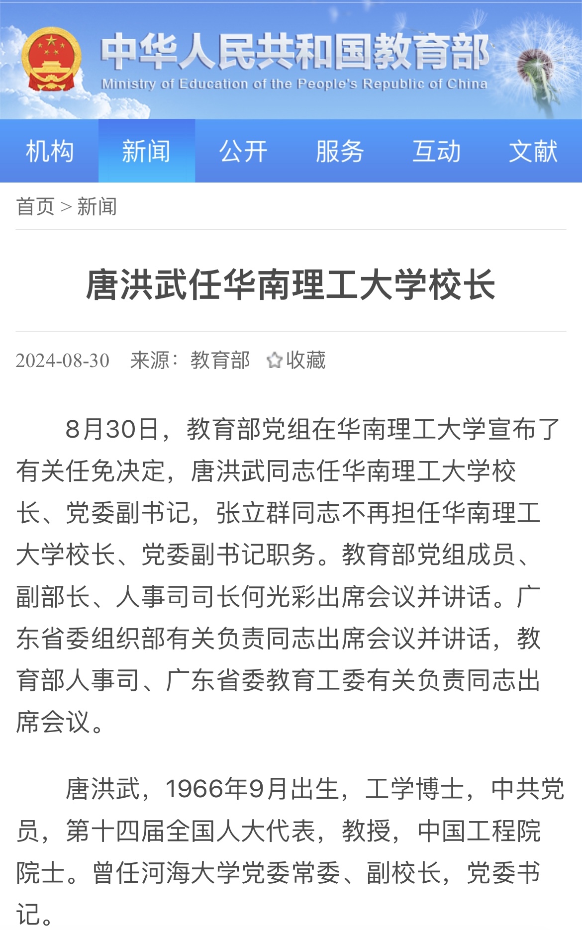现代快报讯(记者李楠)8月30日,教育部党组在华南理工大学宣布了有关任免决定,唐洪武任华南理工大学校长、党委副书记,张立群不再担任华南理工大学校长、党委副书记职务。唐洪武曾任河海大学党委常委、副校长,党委书记。