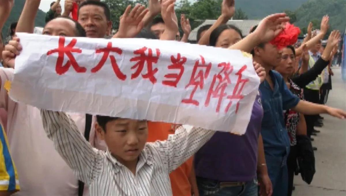 2008年8月2日,当空降兵部队的救灾车队缓缓驶离汶川地震灾区,12岁的程强举起了“长大我当空降兵”标语。这一幕成为当年灾区群众送别人民子弟兵的经典画面。