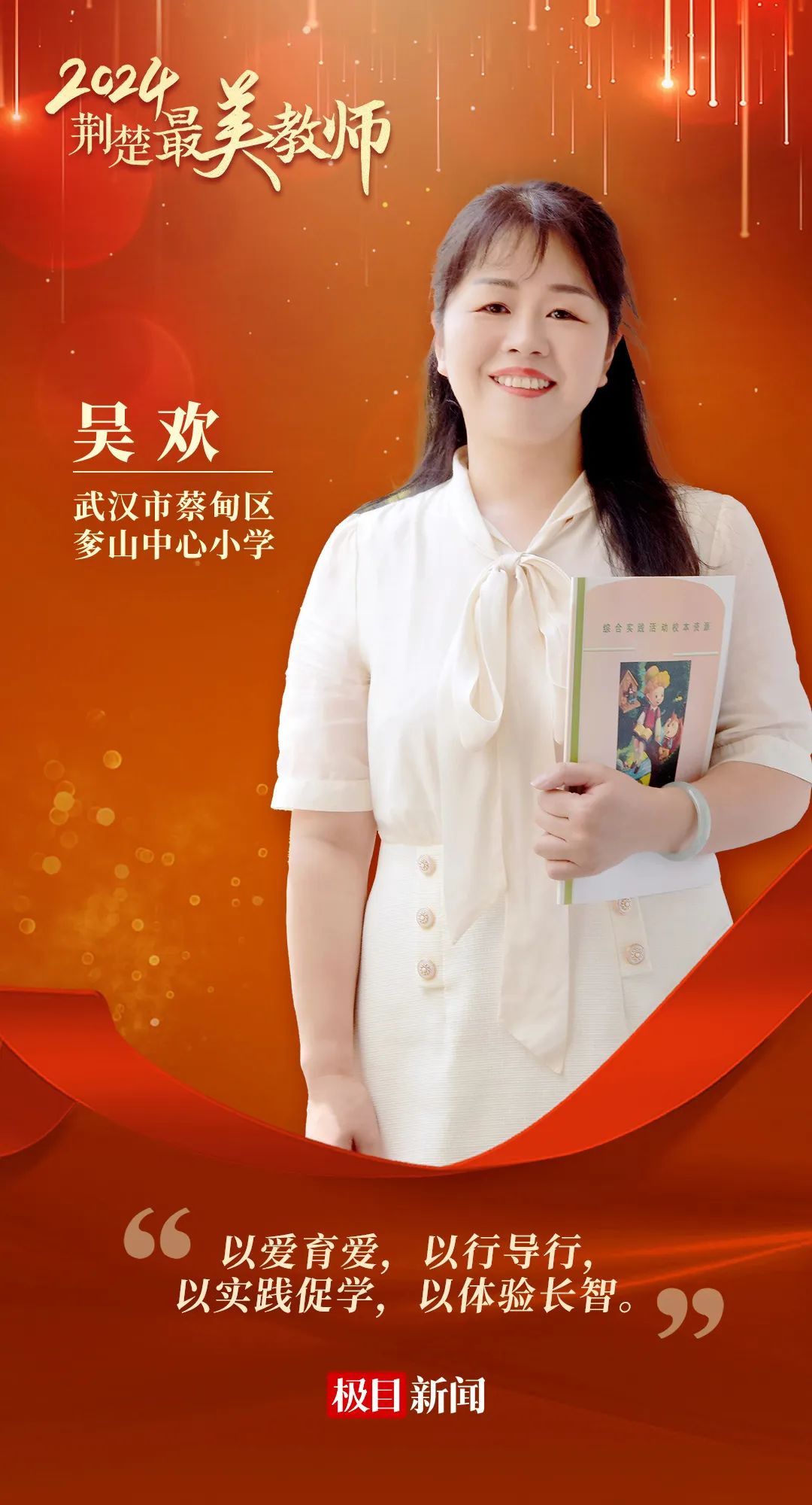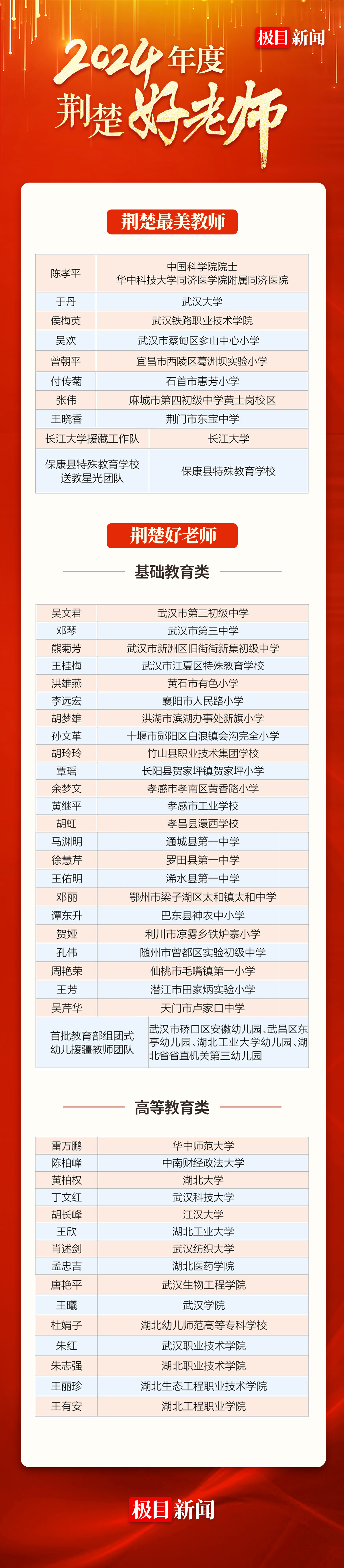 一个多月来,极目新闻记者深入全省各地,进学校、进企业,从城市到乡村,通过采访报道一个个鲜活生动的教书育人故事,宣传在促进学生德智体美劳全面发展、推动教育高质量发展、服务湖北经济社会发展等方面作出突出贡献的优秀典型,展示新时代新征程湖北高质量教师队伍建设的突出成就。今日,2024年“荆楚最美教师”“荆楚好老师”身影闪亮。他们是全省68.7万名专任教师中,牢记为党育人、为国育才的初心使命的师德标兵,也是躬耕教坛、立德树人,为奋力谱写教育强国荆楚篇章作出贡献的时代先锋。近年来,湖北省共涌现出“荆楚好老师”377人(组),推动形成“校校有典型、榜样在身边、人人可学做”良好局面,有效激发好老师不断涌现的群星效应。湖北先后涌现出“全国最美教师”熊有伦、“全国教书育人楷模”马丹、“全国模范教师”彭玉生等一大批全国师德典范。