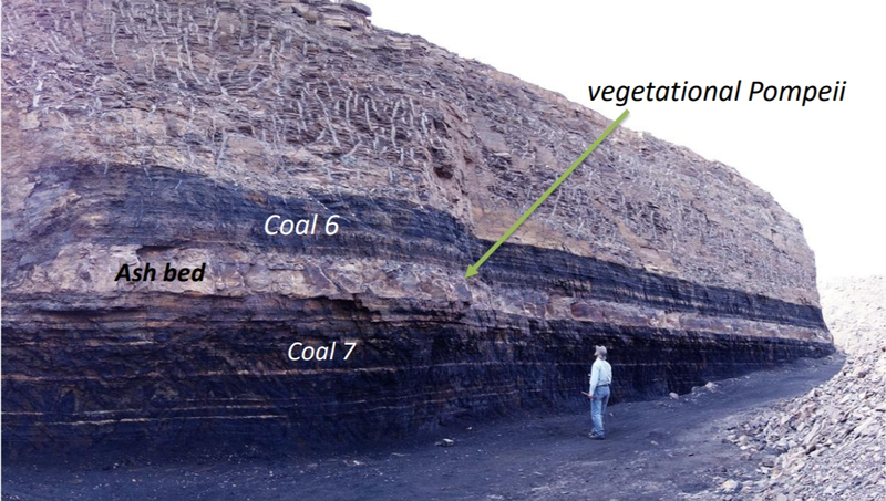 通过火山灰内高精度锆石定年表明为距今约2.98亿年,与石炭-二叠纪之间的界线年龄十分接近,是最早的二叠纪成煤森林。于是,我们还原了2.98亿年前的这一幕——火山喷发使大量火山灰落到乌达大地,把远古森林“封”住了。