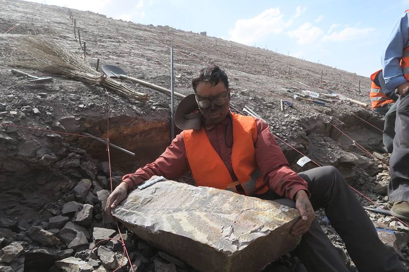2015年,王军在“植物庞贝城”发掘现场搬运植被化石。中国科学院南京地质古生物研究所供图
