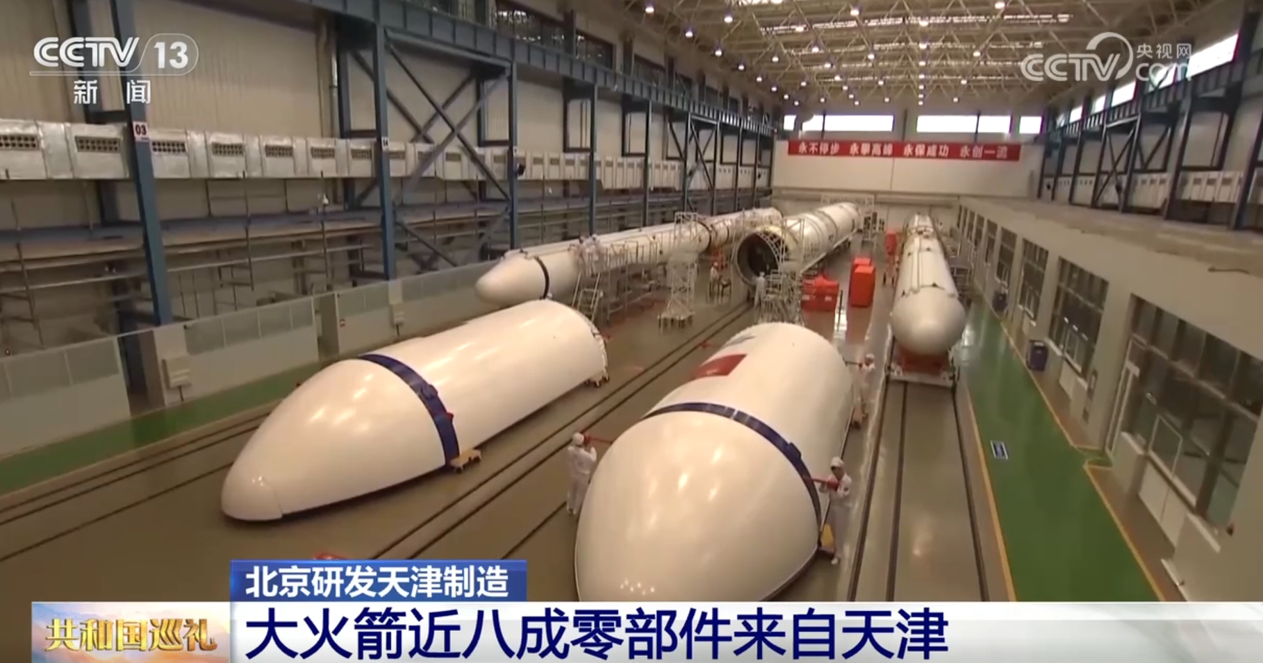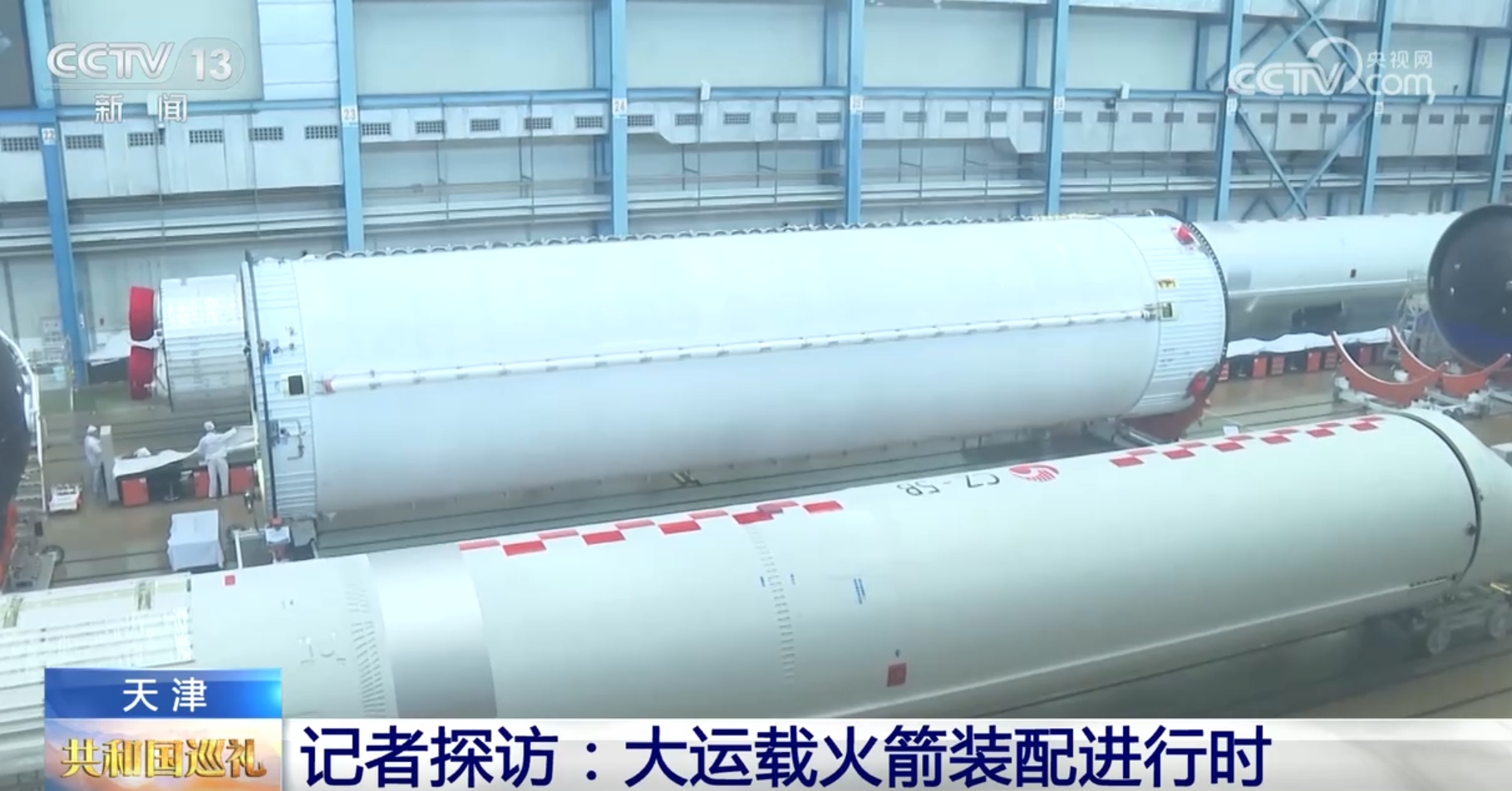 央视网消息:除了空间站以及太阳帆板之外,用于发射空间站的长征五号系列运载火箭也同样在天津完成总装。长征五号系列运载火箭是目前我国,也是全亚洲,运力最强的火箭,大家还给它起了一个可爱的名字叫“胖五”。接下来,我们就到中国航天科技集团一院天津大运载火箭基地,看看“胖五”是如何组装出来的?