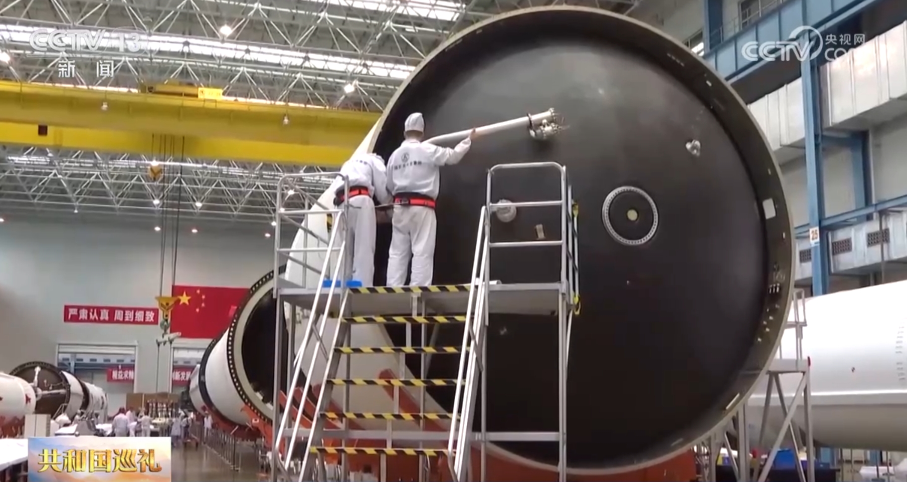 在位于天津的大运载火箭基地,记者来到了长征五号B运载火箭的总装现场。此刻,几名工作人员正在高台上对已完成组装的火箭部件进行检查;而在近处,另外一批工作人员正参照技术标准对各个尚未组装的零部件进行核查检测工作。待一切确认无误,这些零部件将被分批组装,成为火箭的一部分。
