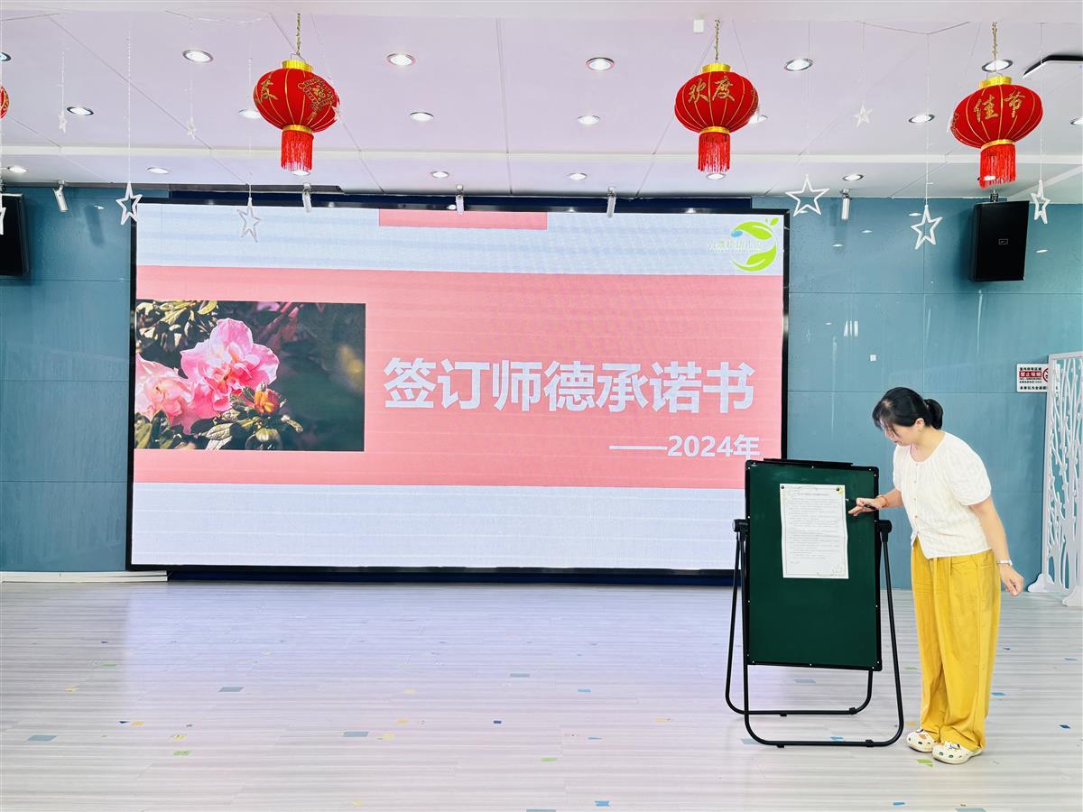 “我是一名光荣的幼儿教师,我的肩上担着民族的希望……”该园全体教师在新入职罗老师的带领下进行廉洁教师宣誓,掷地有声的誓词。该园全体教师重温“廉洁从教承诺书”上的内容,并郑重签上自己的姓名。