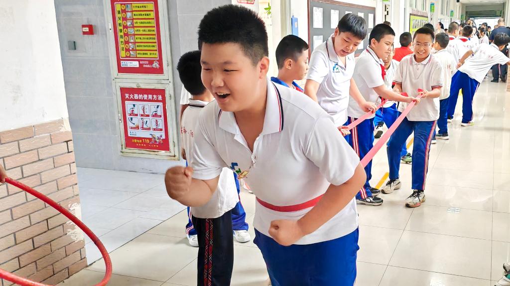 9月4日,准格尔旗大路第一小学的学生在课间休息期间玩拉力带。新华社发(李嘉露 摄)
