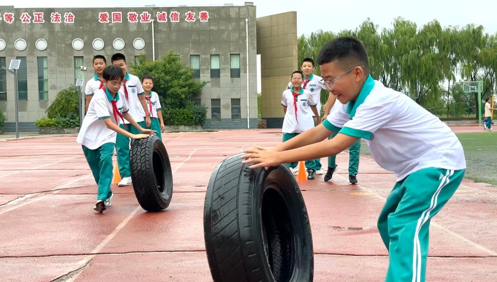 9月4日,准格尔旗大路第一小学的学生们课间休息期间在操场玩滚轮胎的游戏。新华社发(李嘉露 摄)