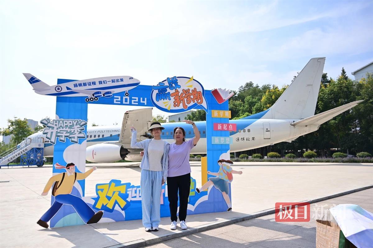武汉城市职业学院迎新现场,后面是退役后用于教学的真飞机