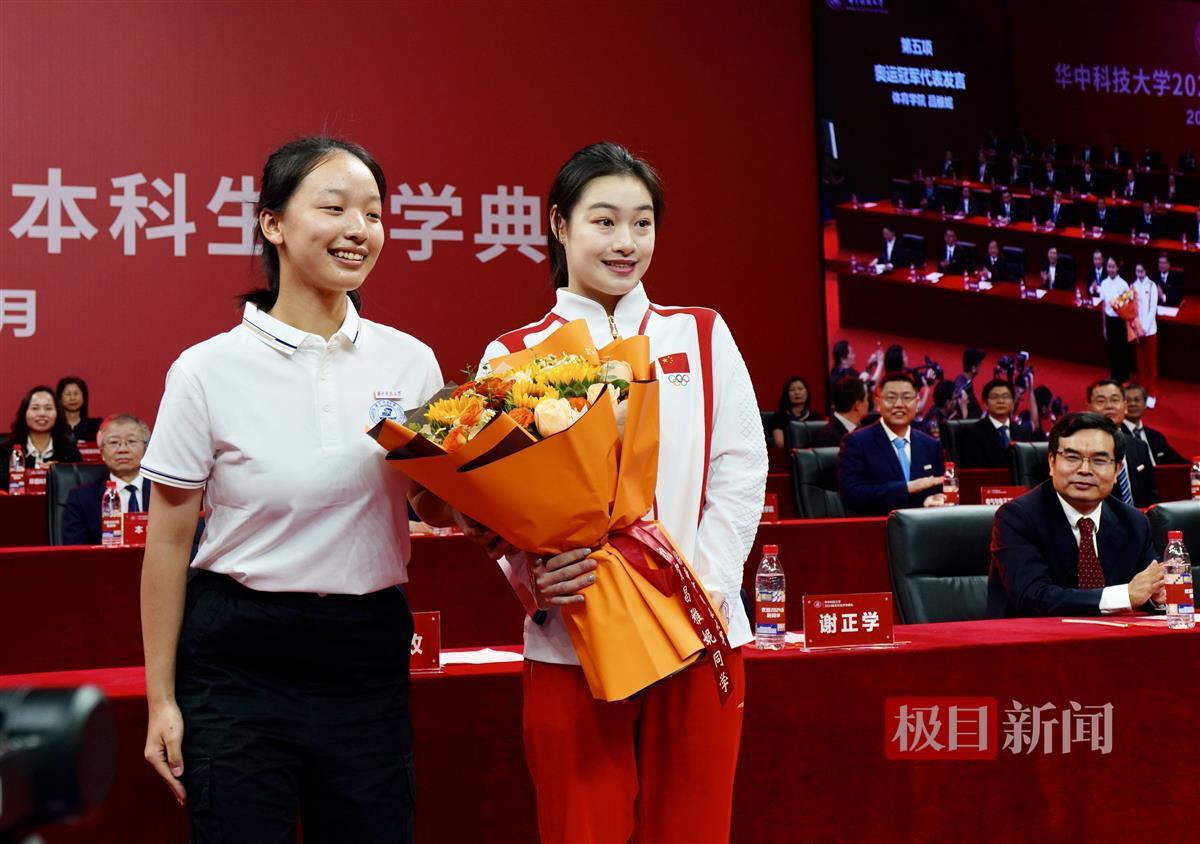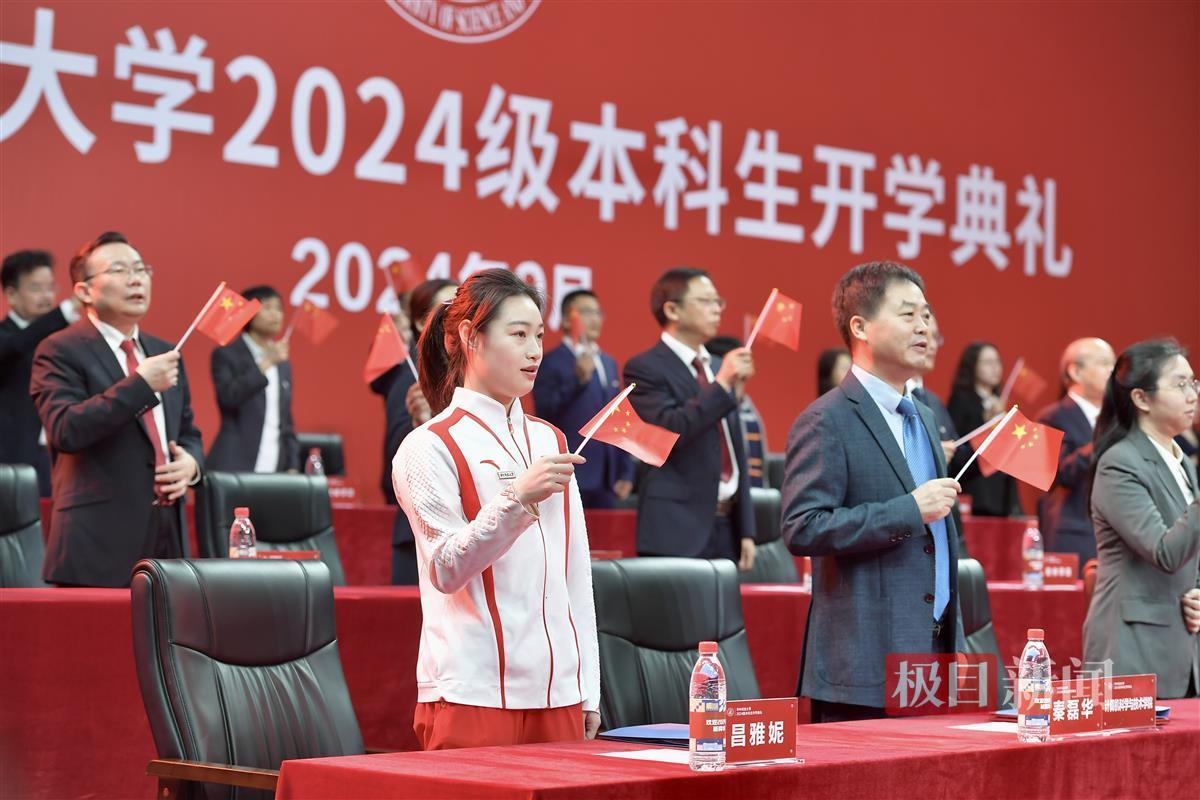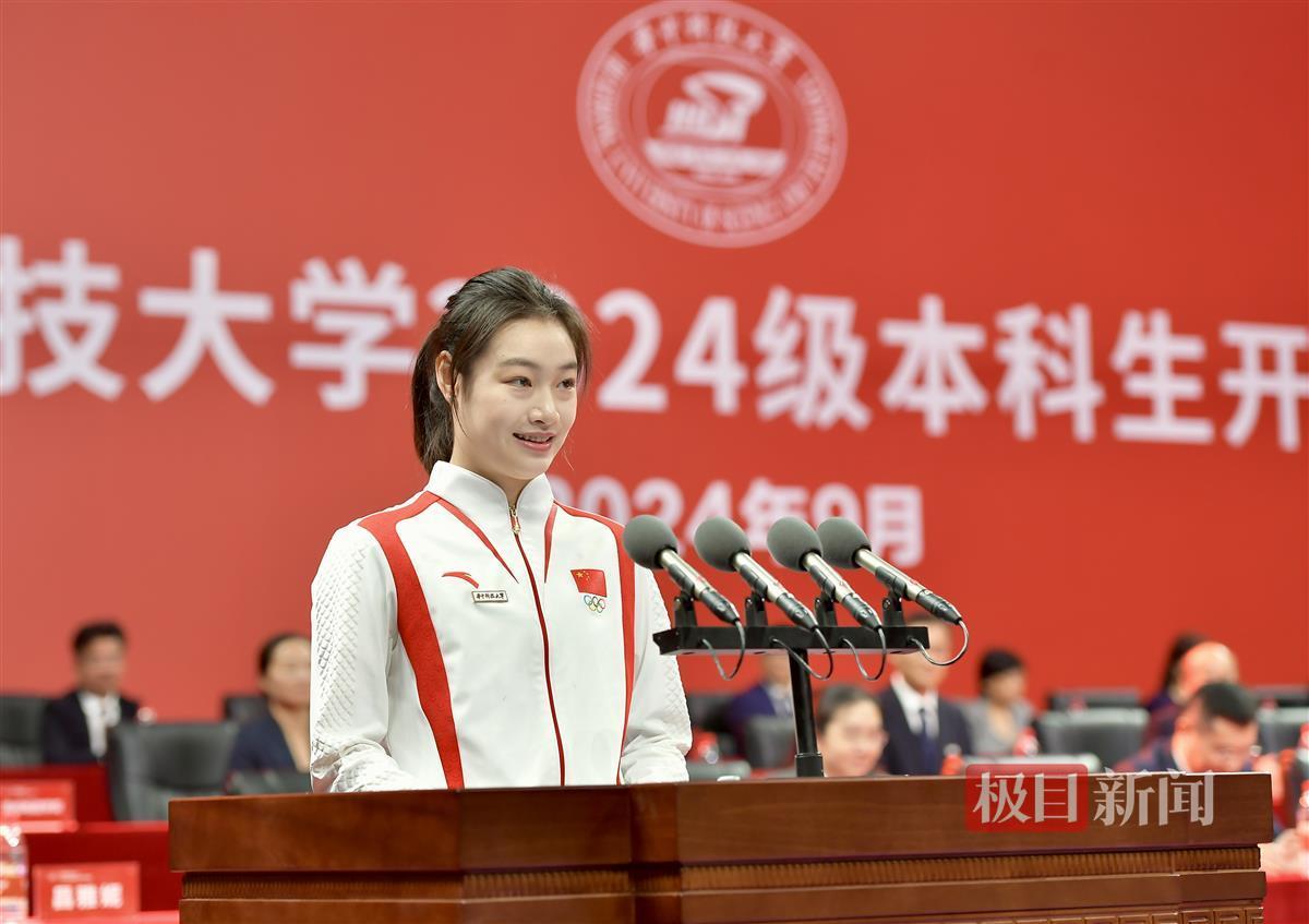 9月11日上午,华中科技大学举行2024级本科生开学典礼。奥运冠军、该校体育学院2020级运动训练专业本科生昌雅妮作为学姐,欢迎新同学加入华中科技大学,并与他们分享了奥运夺金的故事。