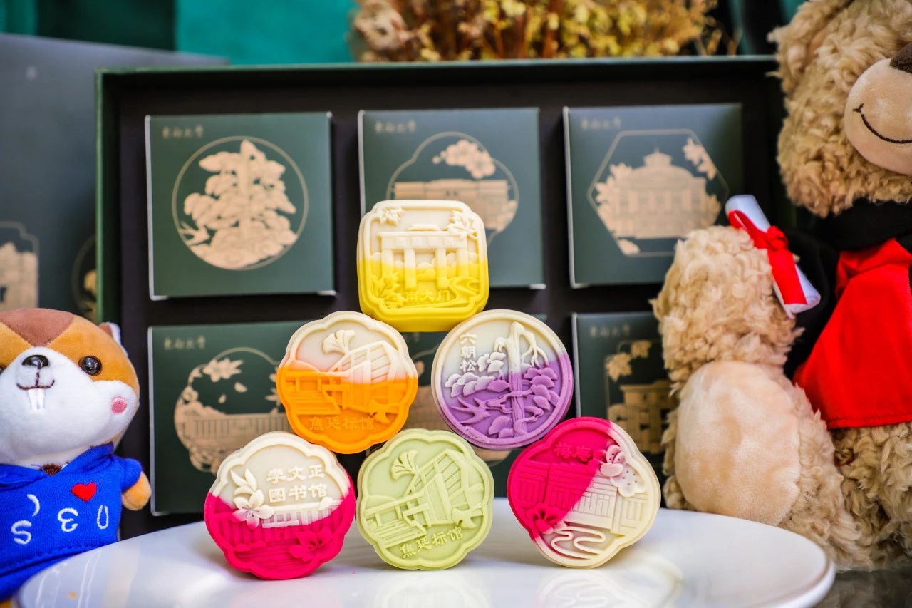 从礼盒外表到月饼内里每一处,都隐含着满满的巧思。饼皮围绕“东大限定美景”精心定制,历经沧桑的六朝松、见证学子成长的校园大门、百年建筑大礼堂……东大人耳熟能详的地标建筑成了舌尖上的美味。