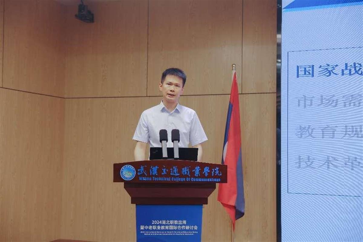 湖北省教育厅副厅长周启红致辞。周启红表示,省教育厅深入贯彻落实党中央、教育部、省委省政府关于职业教育对外开放的重大战略,将职业教育对外开放作为教育强省建设的重要任务之一,着力实施“职教出海”工程。希望以此次研讨会为契机,进一步推动中老职业教育合作走深走实,助力构建湖北新时代职业教育体系新生态。