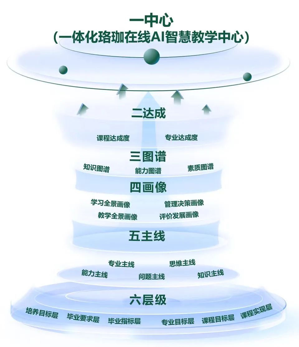 珞珈在线采用了人工智能、大数据、云计算、教育大模型等前沿科技,通过神经网络和自然语言处理技术实现了多维度的“教、学”、深层次的“管”、全方位的“评”以及专业发展全景描绘,构建了“六层级、五主线、四画像、三图谱、二达成和一中心”的整体框架,有效推动了教学精准化、学习个性化、管理数字化、评价多元化、平台数智化,将“教·学·管·评”四个关键环节进行了智能融合。