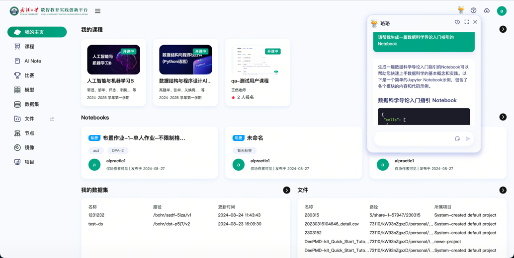 与此同时,在卫星导航定位技术研究中心的办公室里,郭迟老师正紧张地准备着“人工智能与机器学习”的课程。他的目光不时落在电脑屏幕上的武汉大学数智教育实践创新平台(简称“实创平台”),在那里,另一位AI助教珞珞正以活泼好动的姿态等待着同学们的到来。不同于珈珈的温婉书香,珞珞更像是一位充满激情的探险家,他助力同学们动手编代码,引领同学们在数字技术的底层架构中探索与遨游。