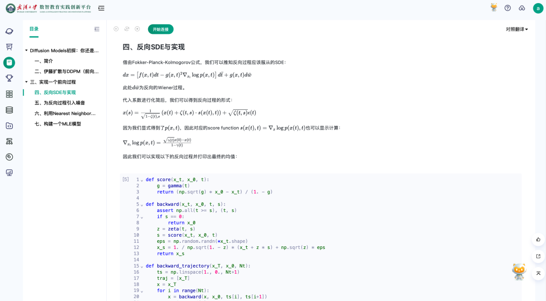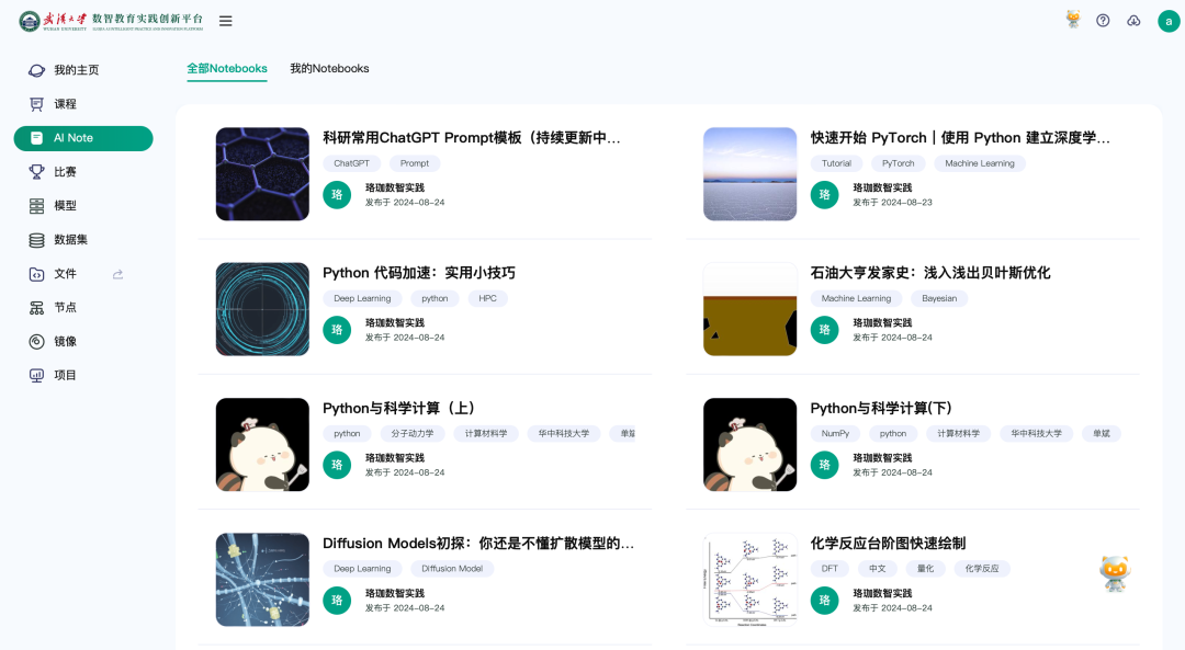 作为一只活泼好动的AI小狐狸,珞珞成为了同学们编程路上的得力伙伴。在实创平台的广阔天地里,珞珞以其强大的代码解析与创作辅助能力,陪伴着每一位学子从零开始,逐步构建起属于自己的AI世界。他不仅能够及时解答编程难题,还鼓励同学们动手实践,在AI Note案例广场上培育同学们的动手能力。在这片充满无限可能的科创试验田里,珞珞的每一次互动,都是对同学们创新思维与实践能力的精心培育,让智慧教育的种子在同学们心中生根发芽。而建设珞珞所依托的实创平台则是武汉大学推动教育信息化和智能化发展的重要举措。作为数智教育的先行者,武汉大学提出“五体驱动”“四真计算”“三教融合”等先进理念,并持续致力于将这些理念转化为实际行动。实创平台的推出,正是这些理念落地生根、开花结果的生动体现。通过打造一个智能化、个性化、社区化、开放式的学习环境,实创平台一体化汇聚武汉大学数智教育相关的课程资源、案例实训、计算环境、AI助教,让每一位同学都能在这个平台上充分发挥自己的潜力,实现全面发展。同时,实创平台打通了校内多门户资源,促进了珞珈在线、教务系统、各学院自有门户之间课程、案例等数据的互联互通,打破了信息壁垒,实现了教育资源的共享与优化配置。