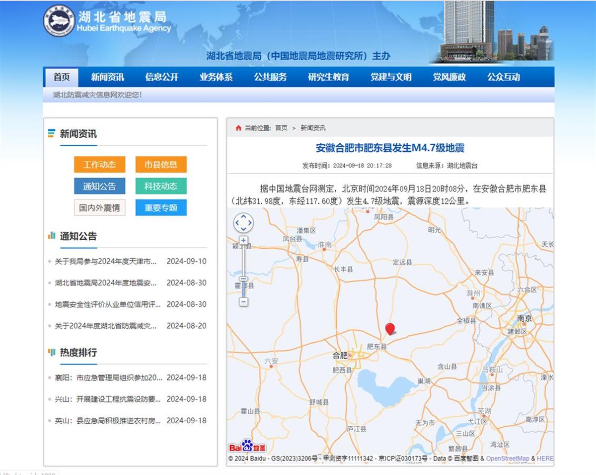 9月18日,中国地震台网正式测定:20时08分在安徽合肥市肥东县(北纬31.98度,东经117.60度)发生4.7级地震,震源深度12千米。