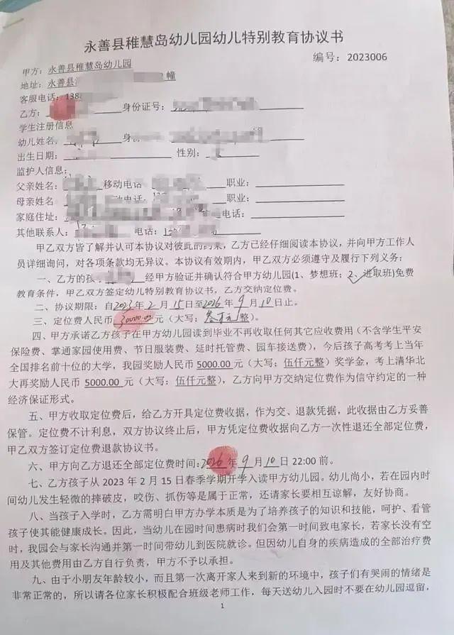 家长们此前与园方签署了一份“特别教育协议书”,约定家长一次性支付三年定位费(学费)共计3万元,期满后园方承诺将全额退款。对此,园方负责人曾回应称经营困难,等其“东山再起”就还钱。