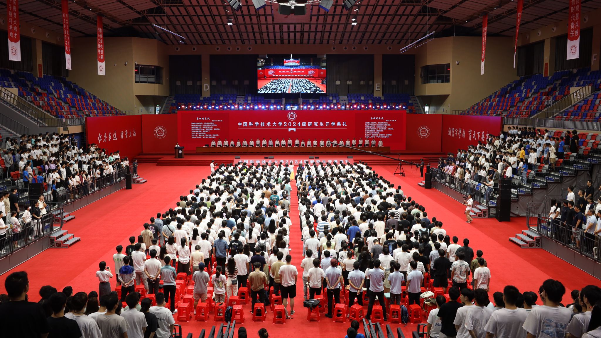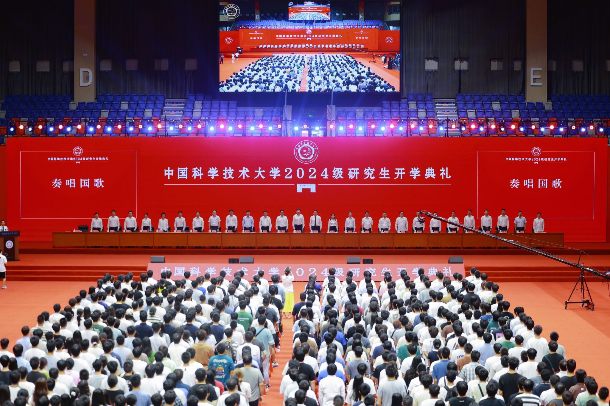 最后,全体师生起立,奏唱校歌,开学典礼在豪迈雄壮的校歌声中圆满结束。研究生新同学们正式成为中国科大人,开启求知与成长的新篇章。