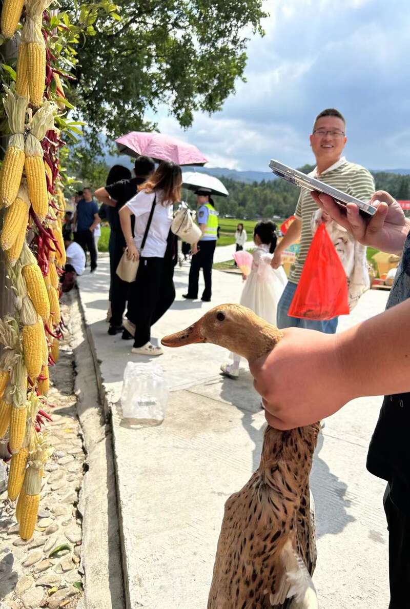 “丰收节”农民趣味运动会“套鸭子”赛后,套中鸭子的大叔跟周围人分享收获的喜悦。