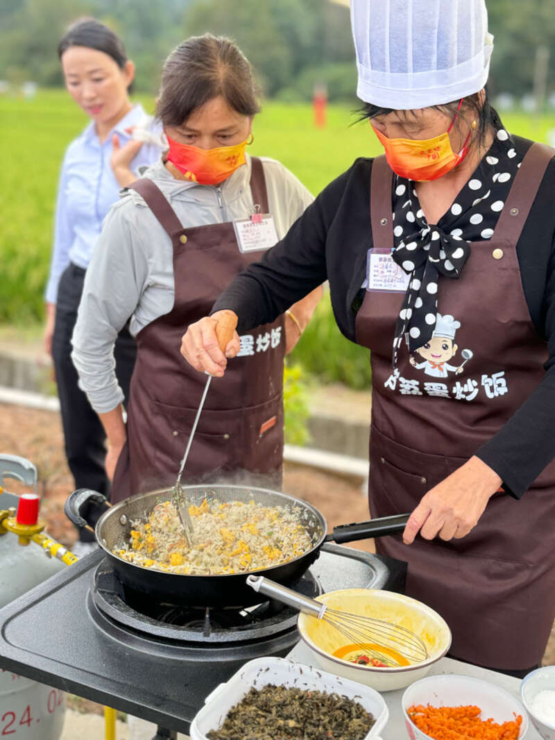 9月22日,在祁门芦荔优质稻米示范产业园举办的“丰收节”上,村民们聚集在田间空地做起了蛋炒饭,最简单的食材做出了极具风味的美食。稻田边欢声笑语,伴随着稻浪的翻滚,同学们在此体验到一场独具乡村韵味的“丰收盛宴”。