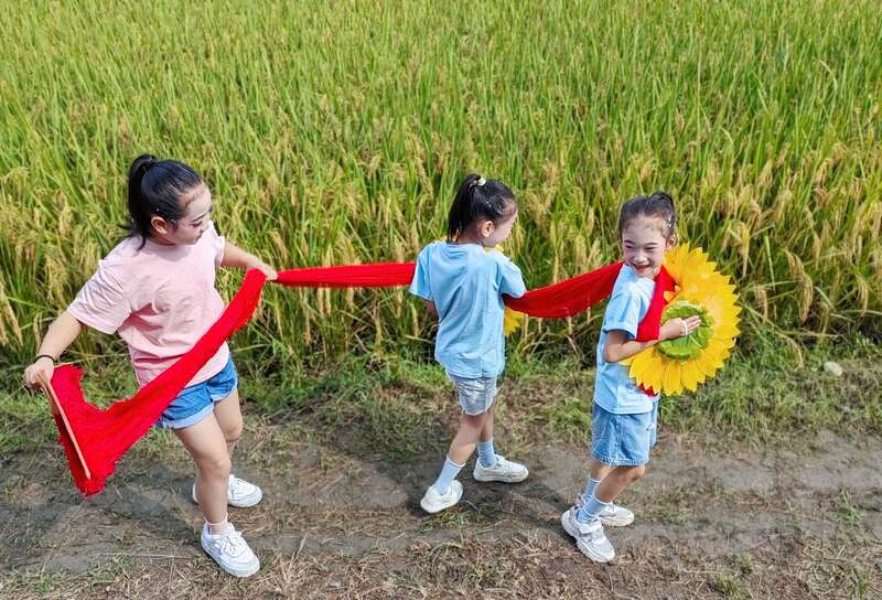 9月22日,“丰收节”现场,小朋友们在稻田边嬉戏玩耍。中国中医科学院2023级博士研究生吴新新/摄