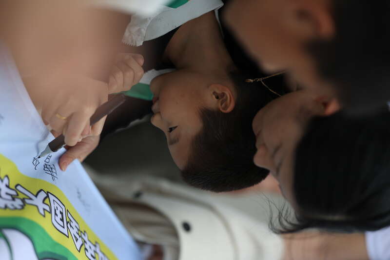 在“丰收节”活动现场,我们邀请小朋友在“全国大学生文明旅游实践活动”的旗帜上签名。有的小朋友拿起笔一笔一画认真地写下自己的名字;有的小朋友还不会写字,家长便握着他们的手一起写。