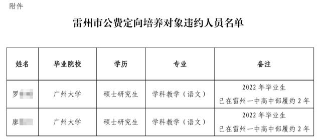 9月5日,雷州市教育局发布《关于罗xx等2名公费定向培养对象违约情况的通报》,通报称: