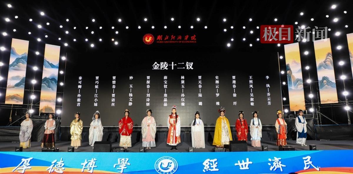 这是9月22日湖北经济学院“经”彩启航迎新晚会上演的节目《一梦红楼》,13位来自学校濯缨汉服社的学生,复刻87版《红楼梦》中主要角色的经典造型,她们身着华服、头戴珠冠,动作端庄秀丽,脚步曼妙轻盈,向现场数千名师生展示中华优秀传统文化之美,用新时代青年的视角和行动致敬经典。