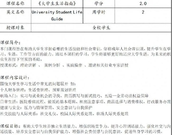 该公选课涵盖医院看病流程、如何使用医保、如何使用交通工具、租房注意事项、学生证的作用、做饭的基本逻辑、商品选择&消费权益等三十五大类知识,包含生活中的方方面面,课程学分为2学分,每周2学时。