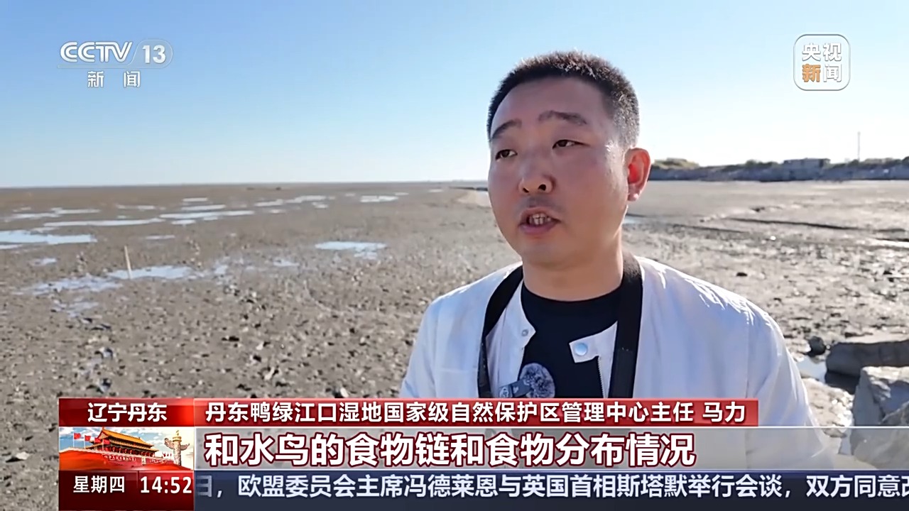 丹东鸭绿江口湿地国家级自然保护区管理中心主任马力:根据调查,我们会掌握水鸟的迁徙情况和水鸟的食物链和食物分布情况。同时我们会通过水鸟的卫星跟踪,掌握水鸟在整个迁飞区的迁飞情况和迁徙时间情况。
