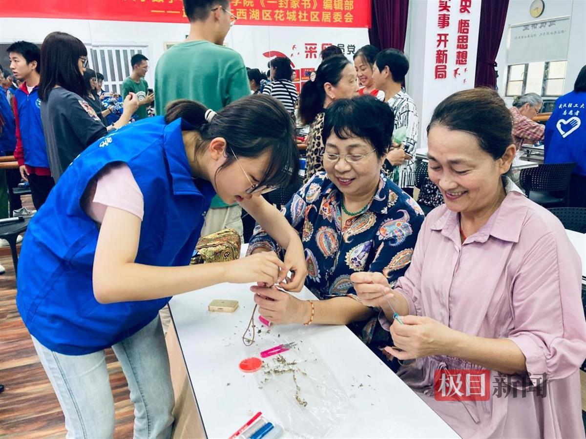 大学生志愿者与花城社区奶奶们一起制作茱萸香包