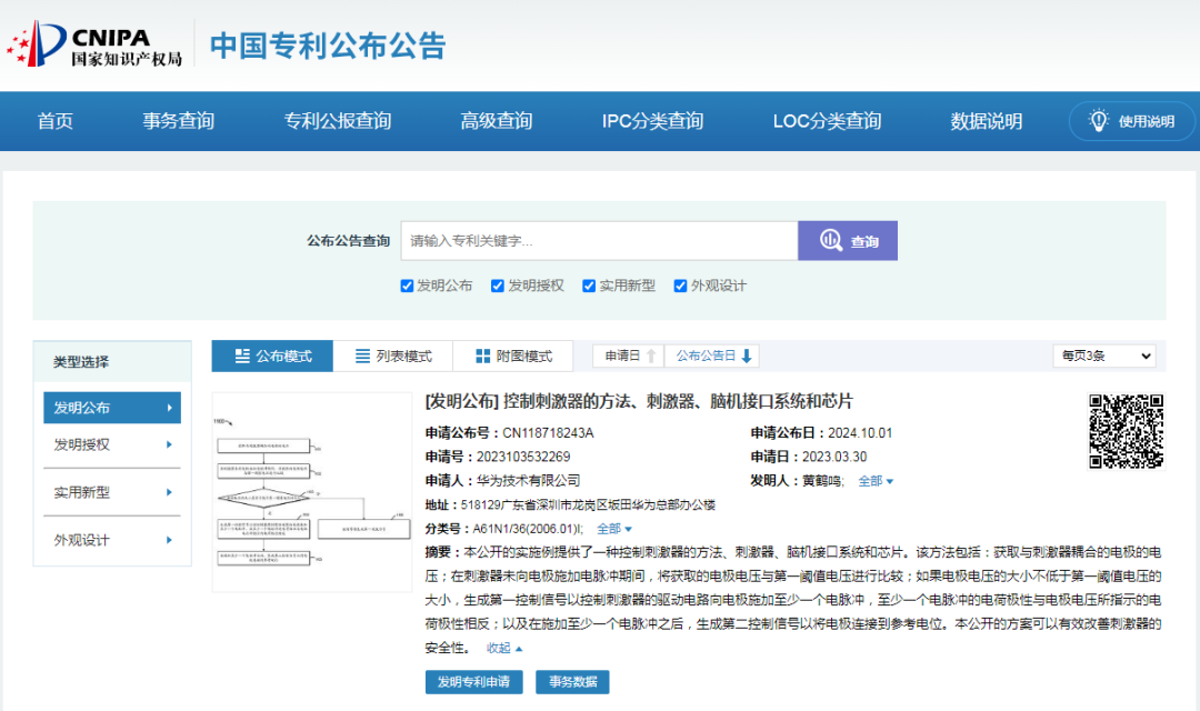 据国家知识产权局网站,10月1日,一份名为“控制刺激器的方法、刺激器、脑机接口系统和芯片”的专利公布在国家知识产权局网站,专利发明人为华为技术有限公司;该专利提供了一种控制刺激器的方法、刺激器、脑机接口系统和芯片。