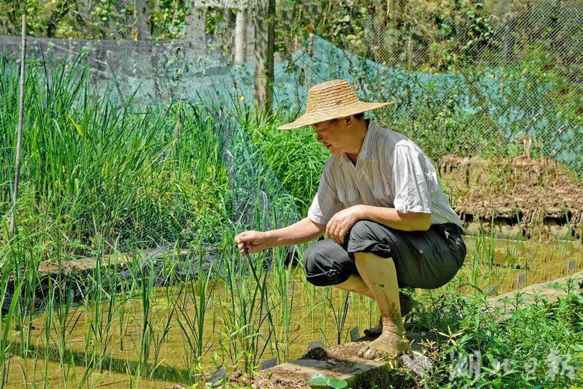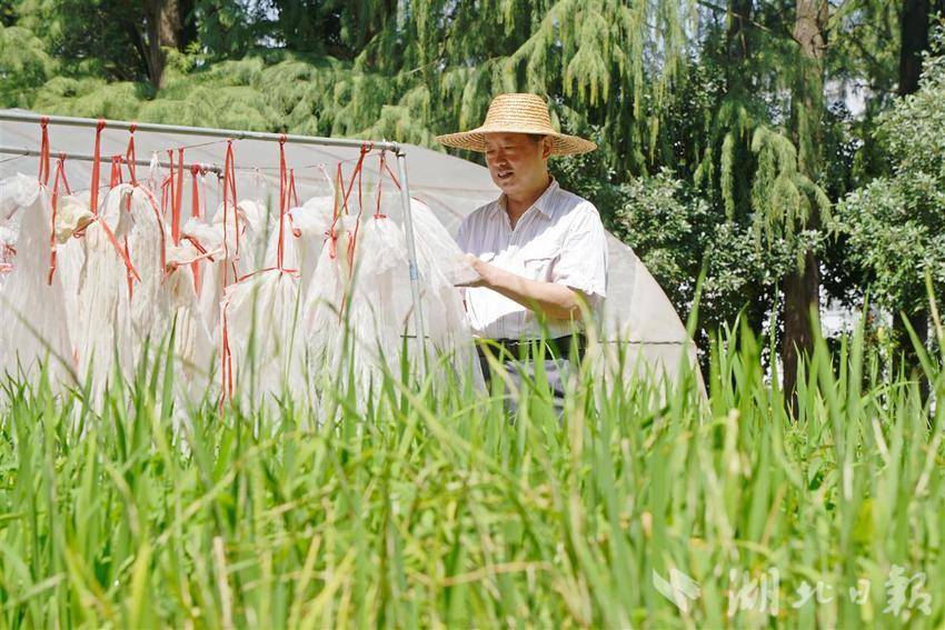 2023年09月6日,在武汉大学实验基地,何光存教授在观察水稻并汇总课题指导情况。(通讯员 曹海钢 摄)