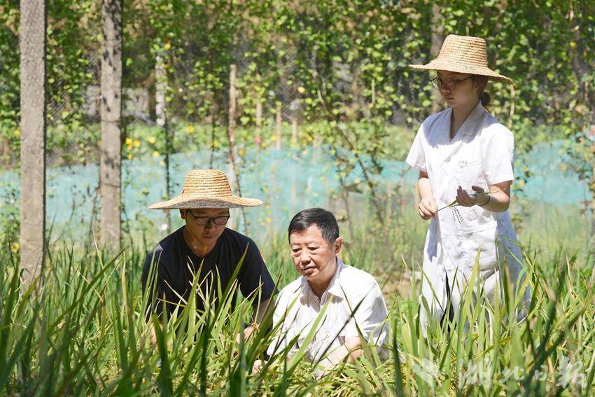 2023年09月6日,在武汉大学实验基地,何光存教授和学生们观察水稻生长情况。(通讯员 曹海钢 摄)