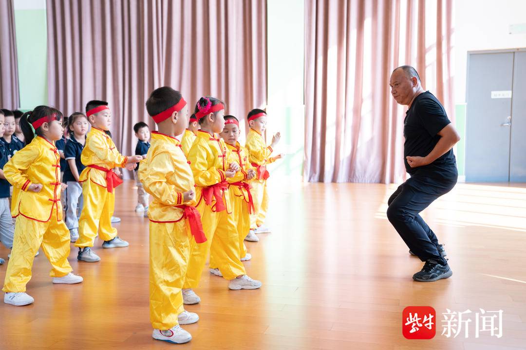 “傲气傲笑万重浪,热血热胜红日光……”近日,伴随着《男儿当自强》的歌声,苏州相城北桥实验幼儿园的船拳活动又开始了。40多名小朋友齐聚一堂,立正、作揖行“拳礼”,在非遗传承人吴林根的带领下练习江南船拳基本功,扎马步、推掌、踢腿,学生们一边喊着“嘿!哈!”一边使出全力,一招一式尽显力量。