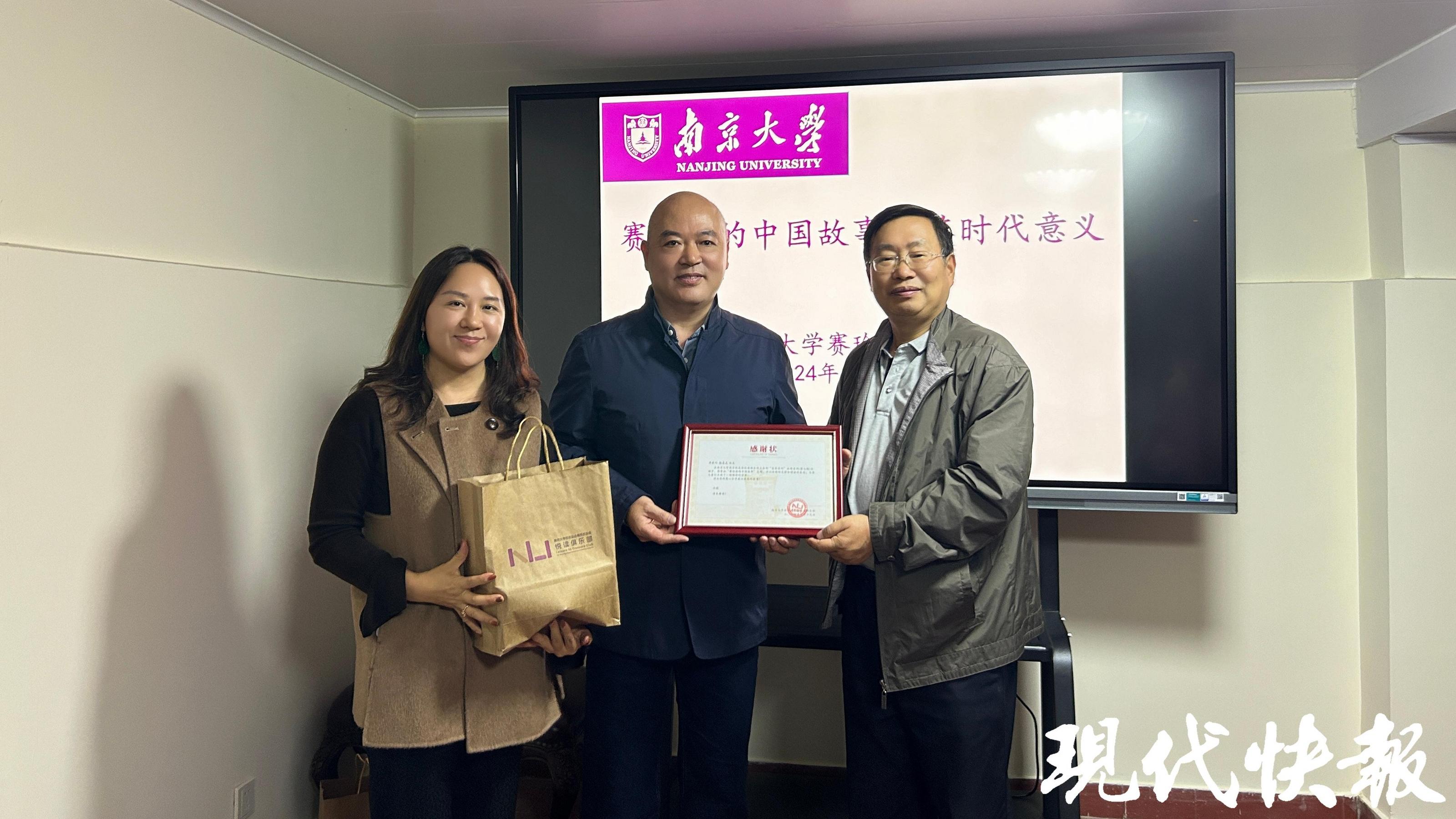 杨善友老师(中)和南大南京校友会悦读俱乐部发起人宋海涛(右)为现场互动者颁奖,左二为杨怡女士杜翊宣摄