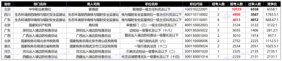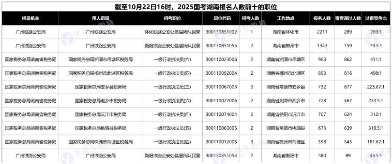 (截至10月22日16时,2025国考报名人数最多前十职位。图片来源:优而仕教育)