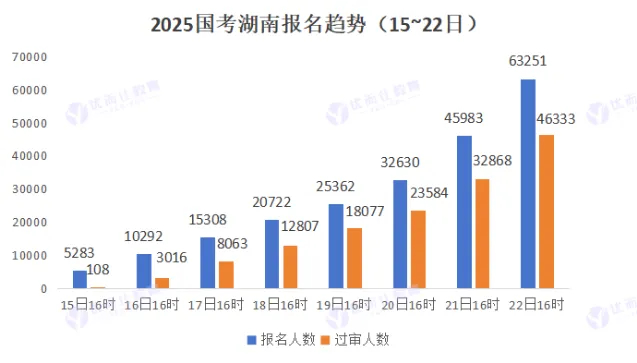 2025年国考职位中工作地点在湖南的职位共计764个,计划招录1519人,截至10月22日16时,报名人数达63251人,审核通过46333人,全省平均过审竞争比为30.5:1。
