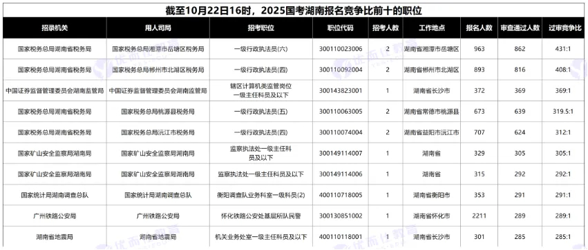从过审竞争比来讲,截至10月22日16时,2025年国考报名人数湖南过审竞争比最高的职位为“国家税务总局湘潭市岳塘区税务局一级行政执法员(六)”,职位代码为300110023006,招录2人,报名963人,已审核通过862人,过审竞争比为431:1。该职位同样无基层工作年限、服务基层项目工作经历等限制,从事基层税务机关税收征管、纳税服务、行政管理等工作。