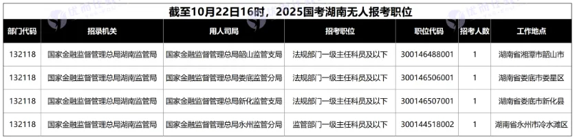 据优而仕教育统计,截至10月22日16时,2025年国考仍有252个职位无人提交报名申请,占总职位数的1.2%,其中工作地点在湖南的有4个。这些被“遇冷”的职位大多位于基层,招录条件设置更为具体。