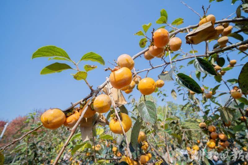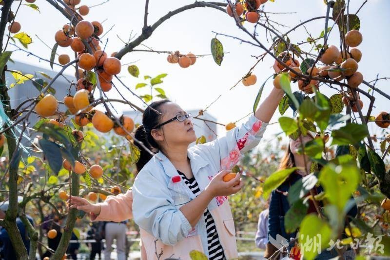 在采摘区,柿子树上缀满了黄澄澄的甜柿,柿子坠在枝头,硕大而饱满,呈现一幅金秋丰收之景。现场热闹非凡,氛围其乐融融、欢快愉悦。