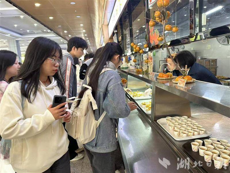 不仅在柿子园,“狮山柿子节”的氛围也在校园弥漫着。在国际学术交流中心,一场柿子宴正在进行。柿子桂花冻、柿子羹、柿子桂花茶……多种柿子美食展示一新,这些美食都是华中农业大学厨师精心创意并制作的。在荟园食堂一楼、竹苑食堂二楼窗口开设了自制柿子美食区,面向师生免费提供柿子汁、炸柿子条、炸柿子饼等美味柿子产品,让更多师生品尝到我校科研转化的优秀成果。