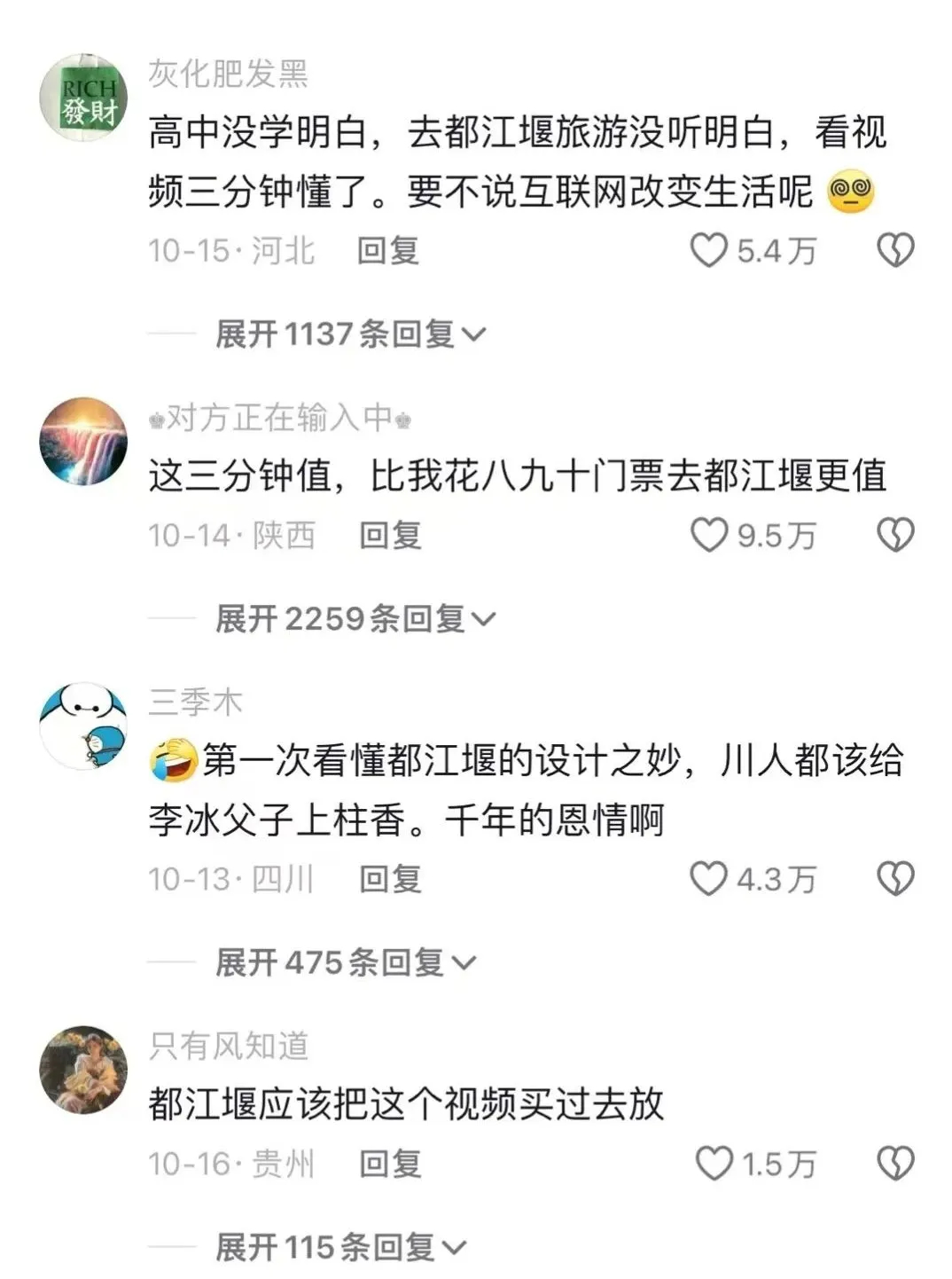 令刘勇惊喜的是,这份用心呈现出来的视频获得了不少网友的关注和点赞,有网友留言表示“高中没学明白,去都江堰旅游没听明白,看视频三分钟懂了!”