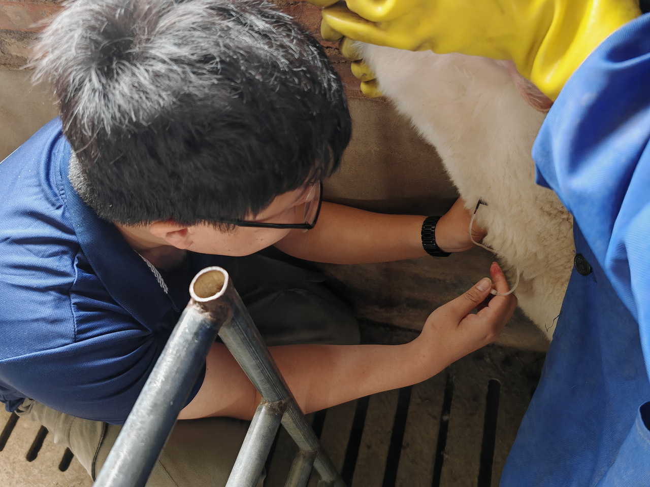 于是,在上学期间,郝坤杰也多次深入养殖场,到生产一线去切实感受畜牧养殖的具体实践过程。“记得一开始到牛场实习的时候,去给牛端粪、拌饲料,当时真的是超出了自己体能的极限,根本拿不动。”他笑着说。从喂养、人工授精等这些养殖实践,到养殖场日常的生产管理,他在一线生产的实践中变得愈发熟练,这也成了他求学生涯中难忘的一段经历。