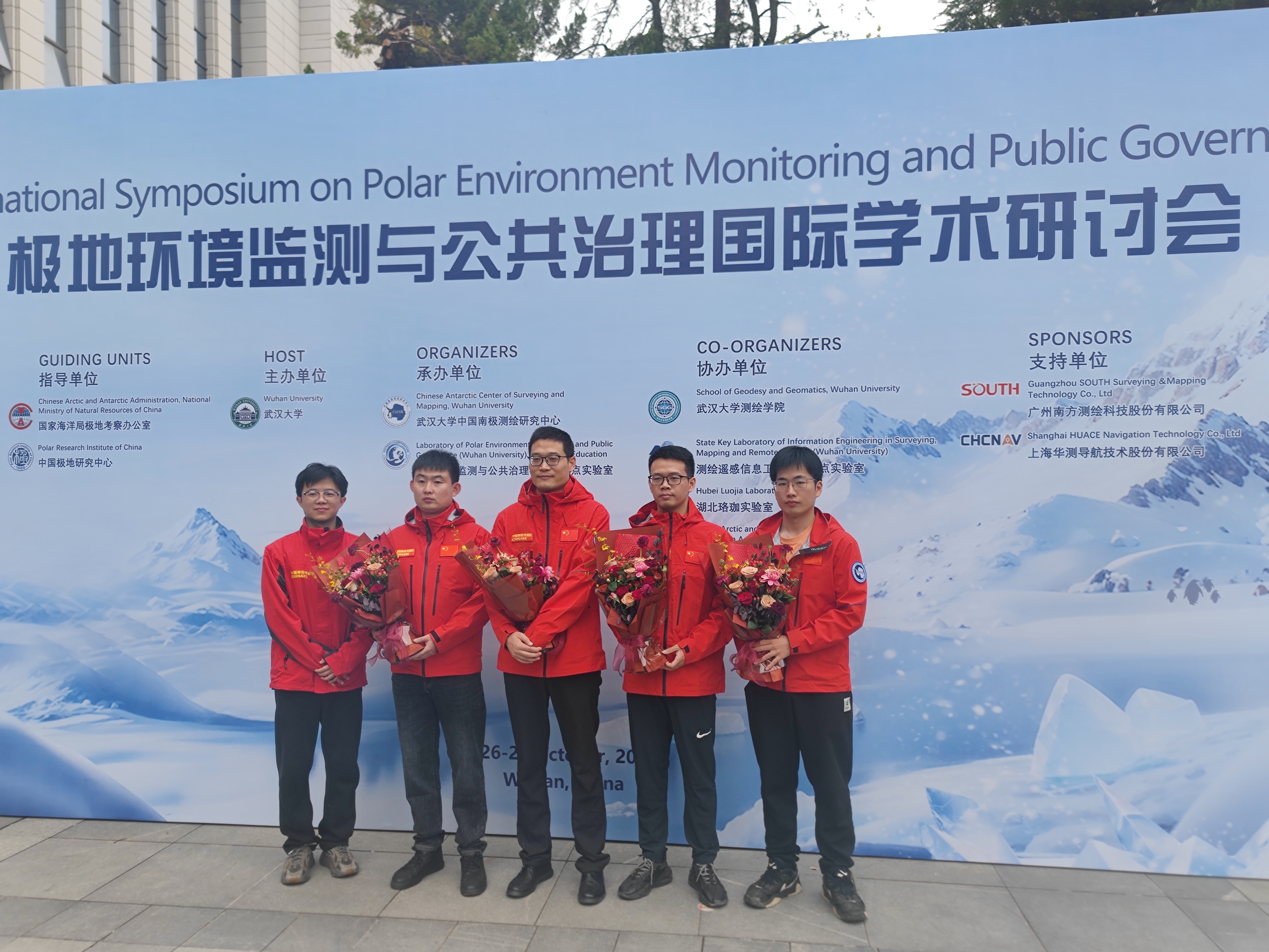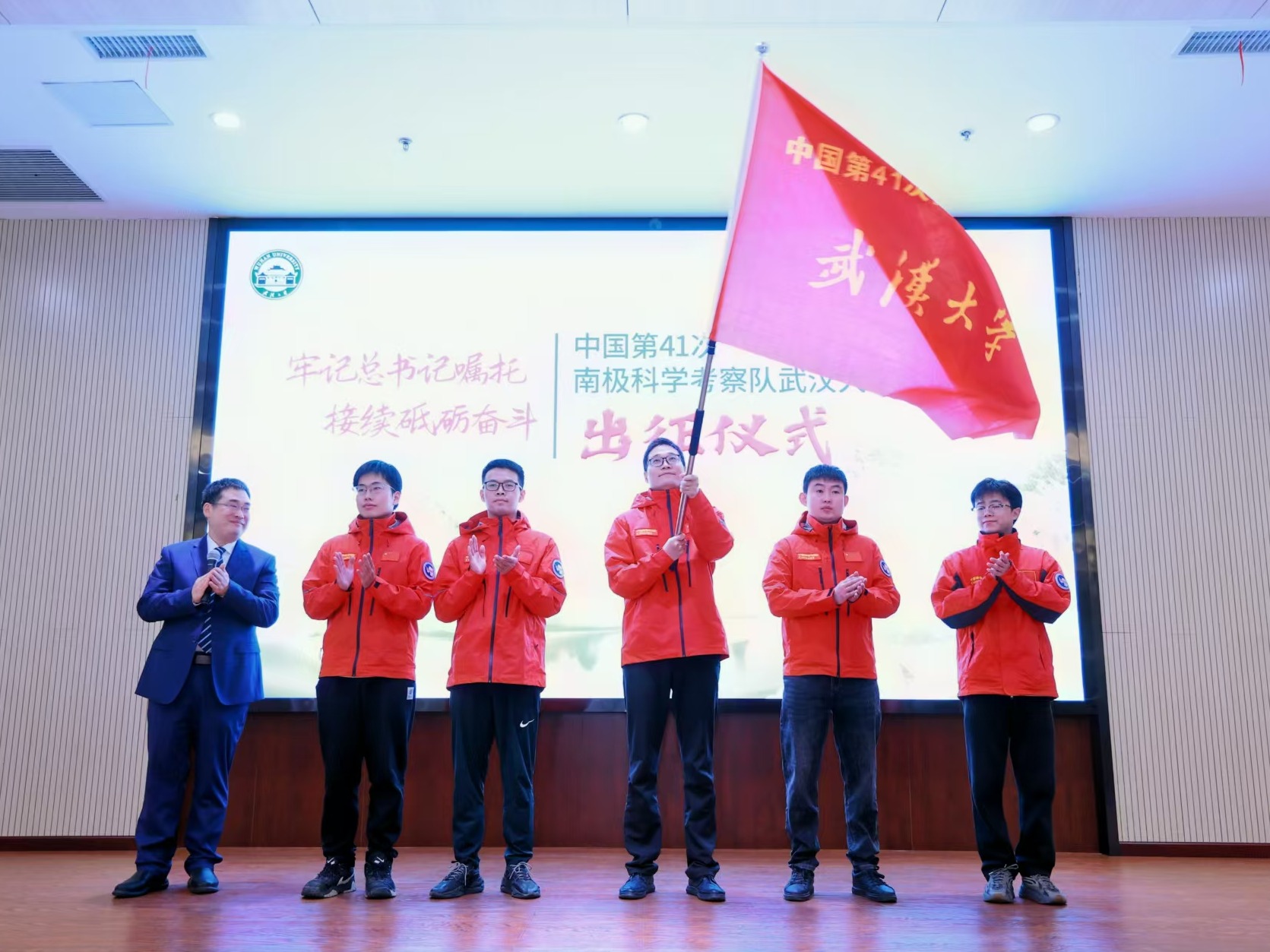 5位即将出征的考察队员从武汉大学党委副书记楚龙强手中接过队旗,他们分别是班伟副研究员、刘明亮博士、梅登奎博士,以及科研助理欧阳润川、朱子渊。5位队员都是第一次参加极地科考,对于即将开启的行程,他们满怀期待。