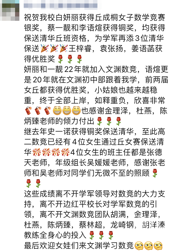 肖老师说:“白妍丽和蔡一靓2022年就加入文渊数竞,李语煊更是2020年就在文渊初中部跟着我学,前两届女丘都获得优胜奖,小姑娘也越来越稳重,终于全部上岸,如释重负,欣喜非常!也感谢金理泽、杜燕、陈炳臻老师的倾力付出。”