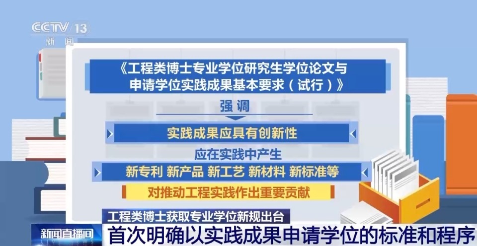今年审议通过的《中华人民共和国学位法》规定,博士研究生可以“通过学位论文答辩或者规定的实践成果答辩申请学位。”其中,“实践成果答辩”是一条新渠道。具体如何实施,近日,国务院学位委员会办公室转发《工程类博士专业学位研究生学位论文与申请学位实践成果基本要求(试行)》,并将于明年一月份开始实施。