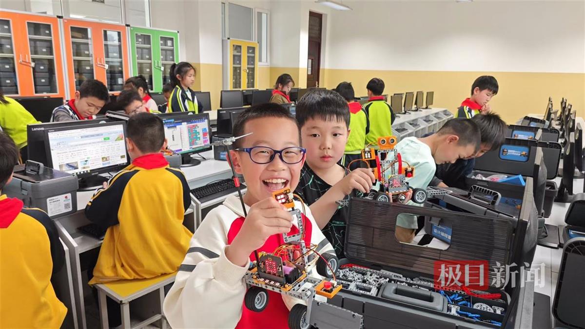 李校长介绍,随着人工智能的兴起,为了让孩子们尝鲜,学校于2020年开设人工智能课,引入校外资源,开发了校本课程:人工智能设计初级课程,内容包括认识AI图形编程、三D打印、机器人设计等,三到五年级每周一个课时。同时,还成立了人工智能社团,在每天课后服务时间开展活动,目前已吸引了200多名学生参与,是学校社团中人数最多的一个。“我已经快学了两年多的时间了,在这个过程中我拼搭了许多的编程小玩具,比如电风扇、遥控小车和点球发射器,我的逻辑思维能力和伙伴协作能力都有了很大的提升。”曾获得湖北省学生信息素养提升实践活动一等奖的胡铭泽同学说。